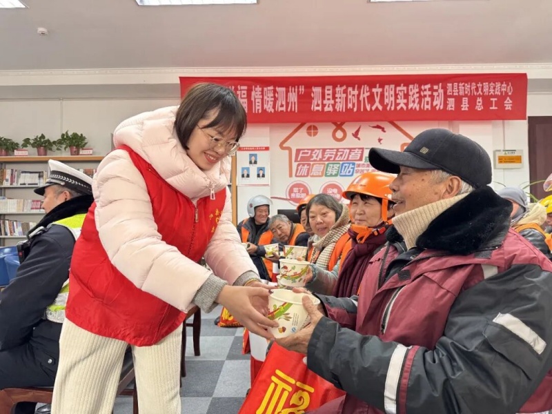 泗县新时代文明实践中心、泗县总工会共同主办的“腊八送福 情暖泗州”主题活动在各点位同步开展,志愿者们将一碗碗腊八粥、一幅幅红“福”字送到市民手中,传递着冬日的温暖。