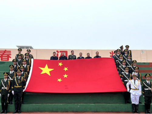 随后,四名护旗手将天安门广场特号国旗展示于主席台。董立敢用生动的语言,讲述“中国第一旗”的知识,使师生们更加深入地了解了国旗的象征意义和历史背景。