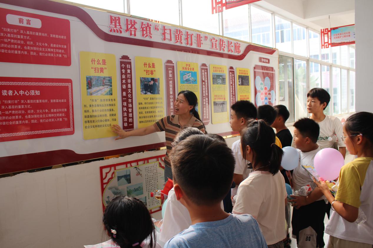 活动中,该镇“扫黄打非”工作站工作人员号召大家共同维护意识形态安全和文化安全,在日常生活、工作中自觉抵制有害思想和文化的传播渗透,积极参与辖区“扫黄打非”巡查和宣传工作,发现问题要及时上报。随后,工作站工作人员带领同学们参观了黑塔镇“扫黄打非”宣传长廊,并对“扫黄打非”知识进行一一解读,引导同学们要阅读正版,健康书刊,自觉抵制各类非法出版物和封建迷信,网络谣言等,倡导学生自觉抵制非法出版物、黄色书刊杂志和淫秽音像制品,做到绿色阅读、文明上网。
